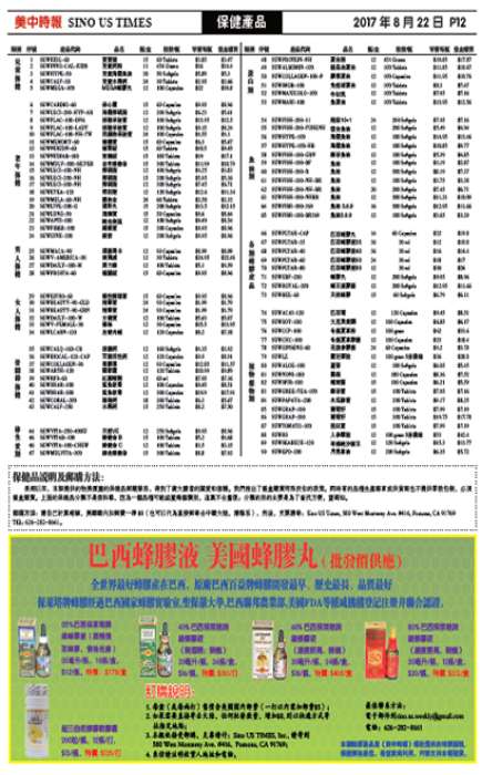 1. 每盒(或每两打)售价含美国国内邮费(一打以内需加邮费$5);2. 如果需要直接寄去大陆,任何批发数量,增加$8, 则以快递方式寄往指定地点;3. 本报只接受邮购,支票请付:Sino US TIMES, Inc., 请寄到580 West Monterey Ave. #416, Pomona, CA 91769;4. 来信请注明收货人地址和电话。最佳联系方法:电子邮件到sino.us.weekly@gmail.com电话:626-282-8661本栏蜂胶产品是《美中时报》报社提供的特价服务,保证价格最低,希望广为利用,并请支持本报发展。...