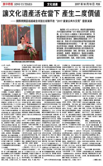 编者按9月18日至23日,广东省友协与广东公共外交协会共同举办“2017广东公共外交周”系列活动,近70名来自14个国家17个友好组织代表、外国驻穗领馆官员和外国留学生代表出席。国务院侨办专家咨询委员会委员、国际民间艺术组织(IOV)全球副主席、暨南大学文化遗产创意产业研究院院长陈平教授应邀出席并发表题为《“一带一路”文化遗产的合作与交流》的演讲。陈平认为,文物古迹可以让历史延续,还可以让历史场景为后人留下想象的空间,研究历史文明的机会。同时,陈平提...