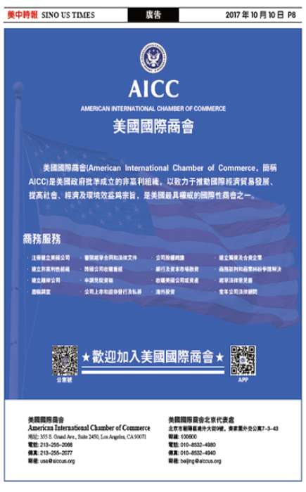 美国国际商会(American International Chamber of Commerce,简称AICC)是美国政府批准成立的非赢利组织,以致力于推动国际经济贸易发展、提高社会、经济及环境效益为宗旨,是美国最具权威的国际性商会之一。