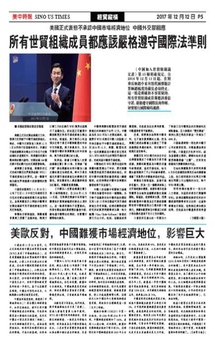 《中国加入世贸组织议定书》第15条明确规定,自2016年12月11日起,在对华反倾销中采用替代国价格计算倾销幅度的做法必须终止。这一点是明确和不容置疑的。所有世贸组织成员都应该重信守诺,严格遵守国际法的准则,切实履行国际条约义务。美国正式向世贸组织提交文件,称美方反对赋予中国市场经济地位。对此,中国外交部发言人耿爽12月1日主持例行记者会时表示,所谓非市场经济国家的概念并不存在于世贸组织的多边规则中,只是个别成员冷战时期的国内产物,世贸组织164个成员...