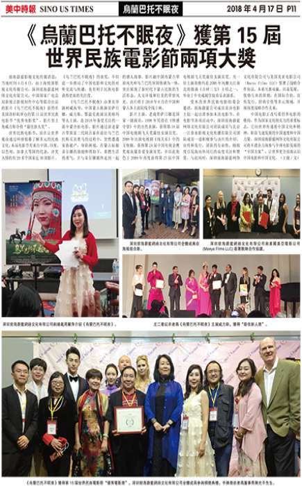 受本次世界民族电影组委会邀请,《乌兰巴托不眠夜》出品人之一、深圳前海蔚蓝网络文化有限公司董事长陈光平先生和副总裁周丽萍女士率领公司团队策划成员陈思涵、陈源、何仕凤、何萍出席本次电影节。与此同时,深圳前海蔚蓝网络文化有限公司与美国美亚电影公司(MaeyaFilmsLLC)签署了战略合作协议,本着互惠双赢、共谋发展、优势互补的原则,在国际合拍、宣传发行、招商引资等多元领域,开展深度战略合作关系。《乌兰巴托不眠夜》获得第15届世界民族电影节“优秀电影奖...