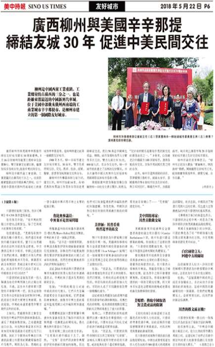 柳州市外事侨务办公室副主任(右)张家蕾与辛—柳姐妹城市委员会主席(左)席乔?汉姆里克前世备忘录。柳州市副市长李辉(右)及辛—柳姐妹城市委员会主席(左)席乔·汉姆里克为香樟树下的大事记揭牌。 广西柳州市与美国辛辛那提市缔结友好城市关系30周年庆典,5月16日在柳州市龙潭公园柳辛友谊园举行。双方签署交流备忘录,继续加深多领域合作,促进中美民间交往。 柳州是中国西南工业重镇,工业总量约占广西的三分之一,也是距离东盟最近的中国新兴汽车城。位于美国中部...