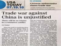 这已不是中国驻美大使首次在美国媒体上发声,批驳特朗普挑起的贸易战了。 美国当地时间7月18日,《今日美国报》网站刊登了中国驻美大使崔天凯题为《特朗普的贸易战既不正当也不公平》的署名文章。文章称,美国对中国强征关税的计划是不正当的,也不会有任何效果。在这场贸易战中,没有赢家,只有失败者。 以下为全文编译: 当全世界都想弄明白美国针对中国所打的贸易战将何去何从时,我们应该停下来想想,审视一下美方的基本论点是否正当。 美国针对中国的...