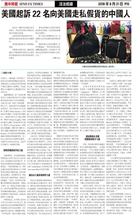 中国北京某商场里卖的假冒名牌皮包(资料照)纽约的一个联邦法院起诉22名中国人,罪名是从中国往美国走私将近5亿美元的假货。这些假货包括路易威登手袋、迈克高仕钱包和香奈儿香水等奢侈品。这些被告当中的21人在星期四被捕。美国联邦检察官说,据称这些嫌疑人用集装箱把伪装成合法产品的中国造假货走私进纽约和新泽西的港口。看来这些嫌疑人打算在美国各地出售这些假货。这些假货的售价将近5亿美元。除了走私和贩卖假货之外,这些嫌疑人的罪名还有洗钱和移民欺诈。美国助理司...