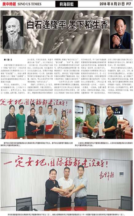 袁隆平丛书文化发展有限公司(下简称“隆平文化”)与深圳前海蔚蓝网络文化传媒有限公司(下简称“前海蔚蓝”)、湖南大唐传媒有限公司(下简称“大唐传媒”)就共同拍摄电视连续剧《齐白石》签署合作协议。左湖南大唐传媒有限公司董事长唐万总先生,右深圳前海蔚蓝网络文化传媒有限公司董事长陈光平先生握手者左:深圳前海蔚蓝网络文化传媒有限公司董事长陈光平先生,握手者右:袁隆平丛书文化发展有限公司董事长黄崎博士左为深圳前海蔚蓝网络文化传媒有限公司董事长陈...