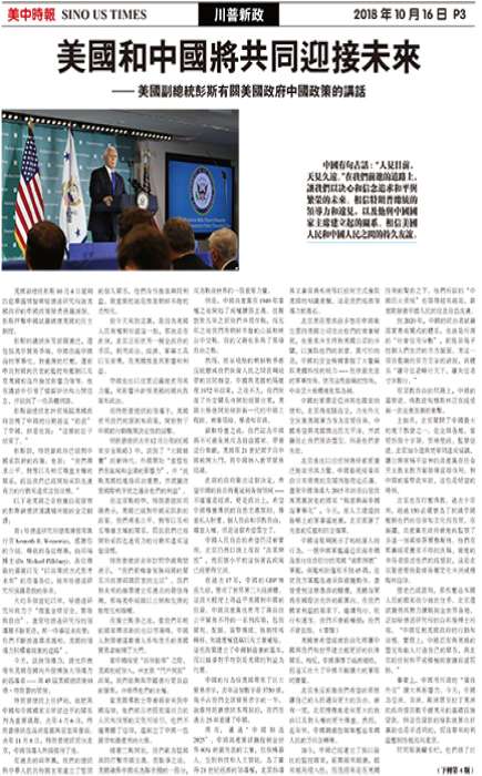 中国有句古话:“人见目前,天见久远。”在我们前进的道路上,让我们以决心和信念追求和平与繁荣的未来。相信特朗普总统的领导力和远见,以及他与中国国家主席建立起的关系。相信美国人民和中国人民之间的持久友谊。美国副总统彭斯10月4日星期四在华盛顿智库哈德逊研究所就美国政府的中国政策发表长篇演说。彭斯抨击中国试图破坏美国的民主制度。彭斯的讲话涉及话题广泛,还包括美中贸易争端、中国在南中国海的军事化、对台湾的打压,还有中共对国内民众的监控和压制以及...