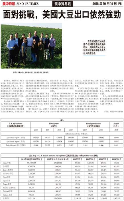 中国代表团参观北达科他州法戈市的食品级大豆种植田。众所周知,美国不但以其高科技著称,而且是世界上数一数二的农产品输出国,小麦、大豆、玉米、棉花和肉类等,每年都大量出口。虽然进口也不少,但是每年农产品的贸易顺差都在200亿美元左右,2014年曾经创下430亿美元的记录,其中大豆位居出口创汇之首。进入2018年,面对国际贸易纠纷,美国大豆出口受到挑战,一度引起中西部部分农业种植户的忧虑。但是随着时间的推进,美国的农产品进出口贸易格局,尤其是大豆的出口市场...
