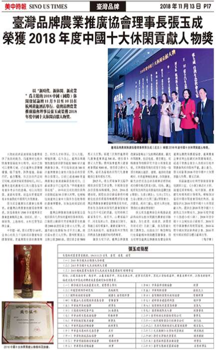台湾品牌农业推广协会 理事长张玉成 荣获2018年度中国十大休闲贡献人物奖