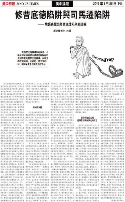既然历史的教训如此深刻,不论是传统的霸权大国还是新崛起的大国都要吸取历史的教训,在历史的教训面前,大家是一律平等的,每一个国家都逃不脱历史的警示。修昔底德陷阱和大国兴衰,是最近人们常提到的问题,而最先提出这个说法的是美国哈弗大学教授,著名学者埃里森,其内容则是古希腊大历史学家修昔底德在其名著《伯罗奔尼撒战争史》中强调的新崛起的大国会挑战传统的大国,从而引发传统大国的恐惧,由此导致战争。前些日子我写过一篇题为修昔底德陷阱与大国兴衰的文...