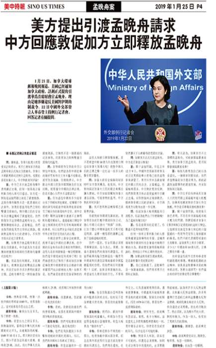 美方提出引渡孟晚舟请求 中方回应敦促加方立即释放孟晚舟
