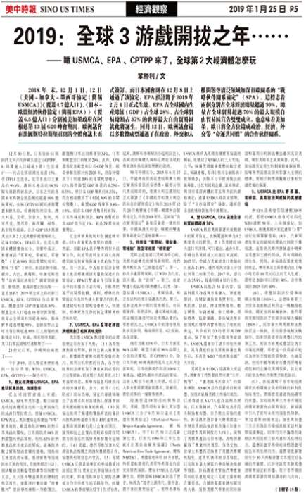 【核心提示】:2018年末,12月1日、12日《美国-加拿大-墨西哥协定(简称USMCA)》(覆盖4.7亿人口)、《日本-欧盟经济伙伴协定(简称EPA)》(覆盖6.5亿人口)分别被美加墨政府在阿根廷第13届G20峰会期间、欧洲议会在法国斯特拉斯堡召开的全体会议上正式签订。而日本国会则在12月8日上通过了该协定,EPA预计将于2019年2月1日正式生效。EPA占全球国内生产总值(GDP)占全球28%、占全球贸易总额占37%的世界最大自由贸易区就此将诞生。同月12日,欧洲议会还以多数赞成票通过...