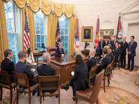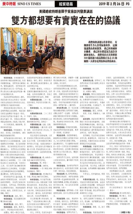 我们的会谈进行得非常好。 有机会发生令人非常振奋的事。 这个协议将由我来签署。 我已经和国会在联系。 我已经在把近况告诉许多国会里的人。 我们现在正在对价值500亿的进口商品征收百分之25的关税—大部分是科技和高科技商品。特朗普总统:非常谢谢你们。很荣幸与中国的副总理见面,他在中国备受敬重。我们在进行贸易谈判,贸易协议谈判。我们有很多来自中国的代表以及—你们知道,你们大部分的人都知道他们是谁—数字来自美国的代表。我认为我们相处得很好。最终,我认为...