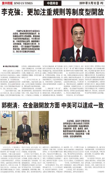 大家知道,最近中美双边贸易谈判里边有六个方面取得了实质性突破,包括技术转移、知识产权保护、非关税壁垒、农业、服务业、汇率,服务业和汇率与金融关系很大,进展是实质性的,我想还会进一步扩大开放,这是毫无疑问的。3月5日上午,十三届全国人大二次会议开幕会结束后,2019年全国两会第二场“部长通道”在人民大会堂举行。中国人民银行党委书记、中国银行保险监督管理委员会主席郭树清:在以习近平同志为核心的党中央坚强领导下,我们的改革开放,金融领域的改革开...