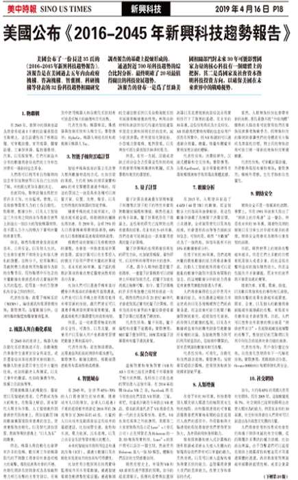 美国公布了一份长达35页的《2016-2045年新兴科技趋势报告》。该报告是在美国过去五年内由政府机构、咨询机构、智囊团、科研机构等发表的32份科技趋势相关研究调查报告的基础上提炼形成的。通过对近700项科技趋势的综合比对分析,最终明确了20项最值得关注的科技发展趋势。该报告的发布一是为了帮助美国相关部门对未来30年可能影响国家力量的核心科技有一个总体上的把握,其二是为国家及社会资本指明科技投资方向,以确保美国在未来世界中的战略优势。1.物联网在2045年,...