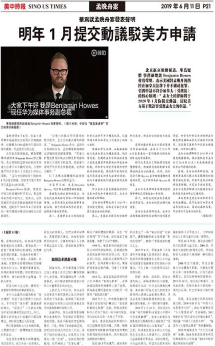 北京新京报网报道,华为媒体事务副总裁BenjaminHowes发出声明,表示美国对孟晚舟的指控在加拿大法律下并不构成犯罪,引渡申请不符合加拿大《引渡法》的核心原则:“孟女士的律师将于2020年1月份提交动议,反驳美方基于欺诈罪引渡孟女士的申请。”华为媒体事务副总裁BenjaminHowes发表声明。(图片来源:中新社“国是直通车”官方微博视频截图)当地时间6月6日,加拿大温哥华卑诗省最高法庭再次召开听证会,讨论华为CFO孟晚舟引渡的技术性议题,但孟晚舟没有出庭。北京新京...
