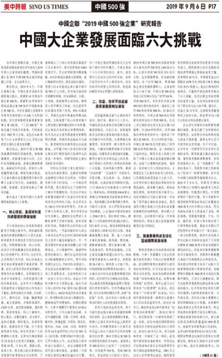 由中国企业联合会、中国企业家协会课题组撰写的研究报告《2019中国大企业发展的趋势、问题和建议》在2019中国500强企业高峰论坛上印发。全文两万多字。报告指出,2019年9月,中国企业联合会、中国企业家协会参照国际通行做法,连续第18年发布中国企业500强,连续第15年发布中国制造业企业500强和中国服务业企业500强,并在此基础上连续第9年发布中国跨国公司100大及跨国指数,首次发布战略性新兴产业领军企业100强。“三个500强”榜单涵盖了我国不同产业、不同地区共计10...