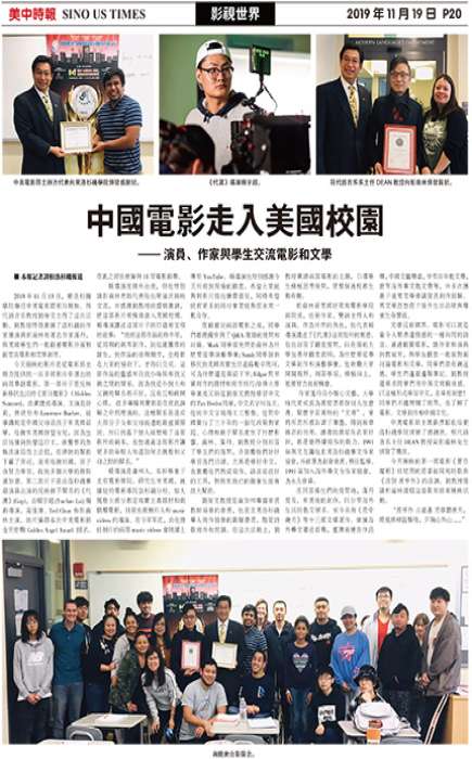 2019年11月13日,东洛杉矶学院举行中美电影节影片展映。现代语言系教授刘荣文主持了这次活动。刘教授特别邀请了洛杉矶的作家兼演员彭南林和著名作家蓬丹,与美国学生们一起观看电影并面对面交流电影和文学创作。与观众合影留念。《代沟》剧组。《代沟》导演赖宇超。今天展映的影片是从电影节主办方提供的一百多部影片中选出的两部华语电影。第一部片子是反映新移民生活的《夏日魔影》(HiddenSummer),由黄捷威导演。主演是徐莉、曾欣怡和LawrenceBucher。故事讲的是中国...