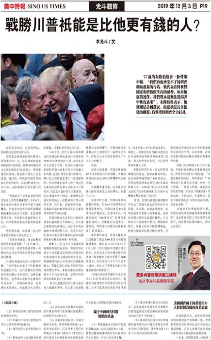 77岁的布隆伯格在一份声明中称:“我们再也承受不了特朗普总统愚蠢的行为。他代表着对我们国家和价值观生存的威胁,如果他赢得连任,我们将永远无法从伤害中恢复过来”。布隆伯格表示,他将团结美国选民,组建广泛且多样化的联盟,为击败特朗普全力以赴。世界是你们的,也是我们的;但归根结底是那些富人的。特朗普是美国历任总统里个人财富最多的一位。他自称拥有超过100亿美元的财富,虽然福布斯的说法是特朗普只有31亿美元。特朗普总统组阁时,提名的人选也大多是富豪...