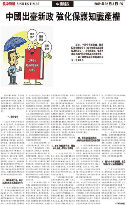 近日,中共中央办公厅、国务院办公厅印发了《关于强化知识产权保护的意见》,并发出通知,要求各地区各部门结合实际认真贯彻落实。《关于强化知识产权保护的意见》全文如下。加强知识产权保护,是完善产权保护制度最重要的内容,也是提高我国经济竞争力的最大激励。为贯彻落实党中央、国务院关于强化知识产权保护的决策部署,进一步完善制度、优化机制,现提出如下意见。一、总体要求以习近平新时代中国特色社会主义思想为指导,全面贯彻党的十九大和十九届二中、三中、...