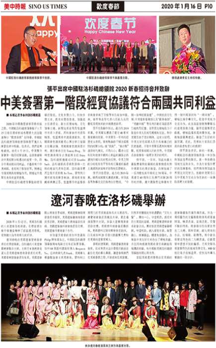 2020年中国农历春节即将来临之际,中国驻洛杉矶总领事馆于1月15日晚在环球影城希尔顿大酒店隆重举行“欢度春节”招待会。中国驻洛杉矶总领事馆总领事张平携夫人陈蔚出席并致辞。他表示,我们高兴地看到,就在1月15日,中美双方签署第一阶段经贸协议,这是朝着解决中美经贸分歧迈出的重要一步,符合中美两国共同利益,不仅有利于中美两国,也有利于整个世界,对稳定市场预期具有积极作用,对稳定中美关系也具有重要意义。中国驻洛杉矶总领事馆总领事张平致辞。侨领处汤长...