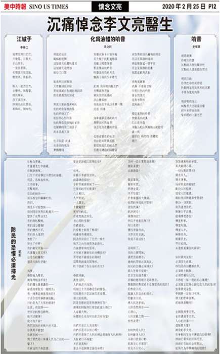 江城子李学江风寒雪舞白茫茫,天地昏,日无光。千山万水,一夜披素装。有情苍天同悲怆,树披孝,云低昂。斯人一逝悲四方,示警哨,无声响。亿民举哀,泪下汇汪洋。但期自此民意张,革弊政,开鸣放。化为液体的哨音宋立民朔风劲且哀蝙蝠翻灯舞这个春天比铁轨还长这个春天是闪婚嫁给了口罩铅云与淫雨联姻天使羸弱而多余那个真诚且抱病的题词者倒在最浓黑的深夜与万人宴的鼎沸相比他的哨音气若游丝他的肺蚀空了只好用心包吹奏他的舞姿是驭鹤的彩排他娇嫩的第二个孩子尚未见过天...