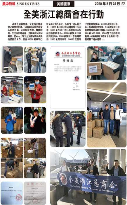 武汉疫情暴发后,全美浙江总商会立即发出倡议,支持国内抗疫情献爱心捐赠活动。大家纷纷响应,慷慨解囊,全美浙江总商会、美国加州温州同乡会、爱心人士等全力支援家乡和武汉疫情防治工作。目前40000只口罩已经全部发到各单位、各部门一线人员手上;10000只口罩已经送到温州三所大学;3000只N95口罩已捐赠海口市疾病预防控制中心;30000只医用口罩捐到丽水市;1000只医用口罩捐到乐清;2000只医用口罩、30000双医用手套捐到宁波市;24000只医用口罩、144防护镜捐到宁波;240...