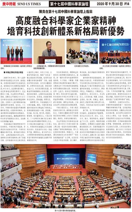 2020年9月19日,第十七届中国科学家论坛在北京召开。论坛主席、中国管理科学研究院商学院院长、发现杂志社社长陈贵在致辞中说,9月19日,是全国科普活动日,也是第20个全民国防教育日,在这样的日子里,在全国科技界学习、贯彻、落实习近平总书记9月11日在科学家座谈会上的重要讲话精神之际,召开第十七届中国科学家论坛显得更加有意义。他指出,十七年来,中国科学家论坛始终围绕传播科学思想,弘扬科学家精神,企业家精神和两种精神的高度融合,产学研高度融合,驱动产...