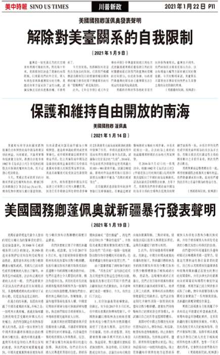 (2021年1月9日)台湾是一个充满活力的民主国家和美国可靠的伙伴,然而几十年来,美国国务院创造了复杂的内部限制,以规范我们的外交官、军人和其他官员与台湾同行的互动。美国政府单方面采取了这些行动,试图安抚北京的共产党政权。不会再有了。今天我宣布,我将解除所有这些自我施加的限制,行政部门机构应认为国务院以前根据授权给国务卿的权力发布的关于对台关系的所有“接触准则”都是无效的。此外,《外交手册》或《外交事务手册》中传达当局或以其他方式意图通过美国...
