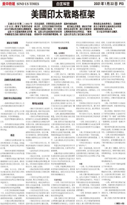 美国白宫星期二(2021年1月12日)解密了特朗普政府2018年制定的美国印太战略框架。这份10页篇幅的机密文件将中国描述为美国主要的安全忧虑,其次是朝鲜,并将与盟友和伙伴的合作、尤其是帮助提升印度的崛起作为制衡中国的一项主要策略。这份文件还强调要帮助台湾发展军事/和非对称作战策略,以抵御中国的威胁。据美国之音报道,国家安全顾问奥布莱恩星期二就白宫解密印太战略框架发表声明说,“解密这份文件是为了让美国人民和我们的盟友和伙伴明白,美国继续致力于确保印太...