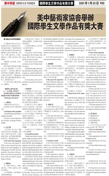 为了丰富美中学生的文化生活,促进学生的文化互动和学术交流,美中艺术家协会、亨锐国际与南加州华人联合总会近日联合发起主办国际学生文学作品有奖比赛。主办方设一等奖:500美金;二等奖:300美金;三等奖:100美金;优秀奖若干。参赛范围,包括美国,中国大陆及港澳台。据美中艺术家协会会长苗广耀介绍,本次大赛主题是:“山川异域,风月同天”。苗会长说,2020年我们共同见证了疫情肆虐,灾难迭起,在2021年新年伊始,人类面临新的挑战,请把2020年让你觉得最美好...