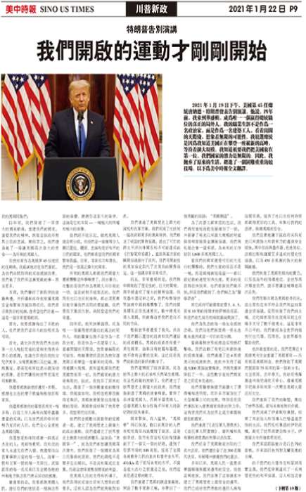 2021年1月19日下午,美国第45任总统唐纳德·特朗普发表告别演讲。他说,四年前,我来到华盛顿,成为唯一一个赢得总统职位的真正的局外人。我的职业生涯不是作为一名政治家,而是作为一名建筑工人,看着开阔的天际线,想象着无限的可能性。我竞选总统是因为我知道美国正在攀登一座崭新的高峰,等待着扩大规模。我知道只要我们把美国放在第一位,我们国家的潜力是无限的。因此,我抛弃了原来的生活,踏进了一个困难重重的竞技场。我的美国同胞们:四年前,我们发起了一项伟大...