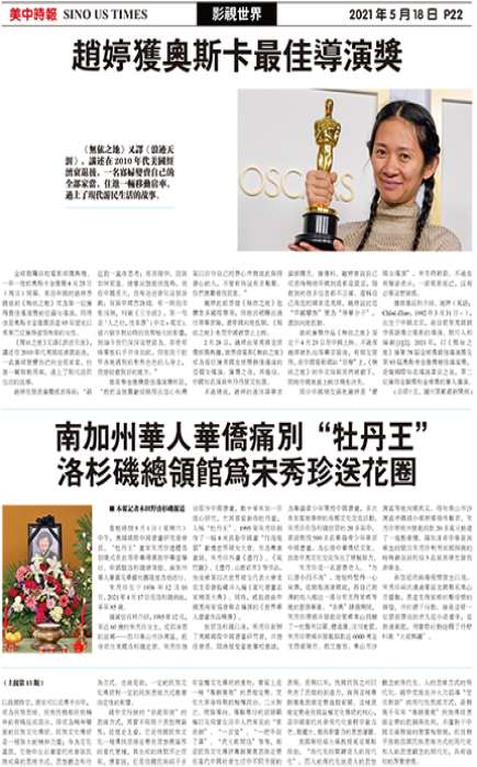 当地时间5月1日(星期六)中午,美国国际中国书画研究会会长、“牡丹王”画家宋秀珍遗体告别仪式在世界中华殡仪馆中华堂举行。中国驻洛杉矶总领馆、南加州华人华侨及华侨社团隆重为她送行。宋秀珍生于1936年12月16日,2021年4月17日在洛杉矶病故,享年85岁。据诚信百科介绍,1995年12月,年近60岁的宋秀珍女士,从郭沫若的故乡——四川乐山市沙湾区,只身前往美国洛杉矶定居。宋秀珍自幼习作中国书画,数十年来如一日潜心研究,尤其喜爱创作牡丹画,人称“牡丹王”。1995年...