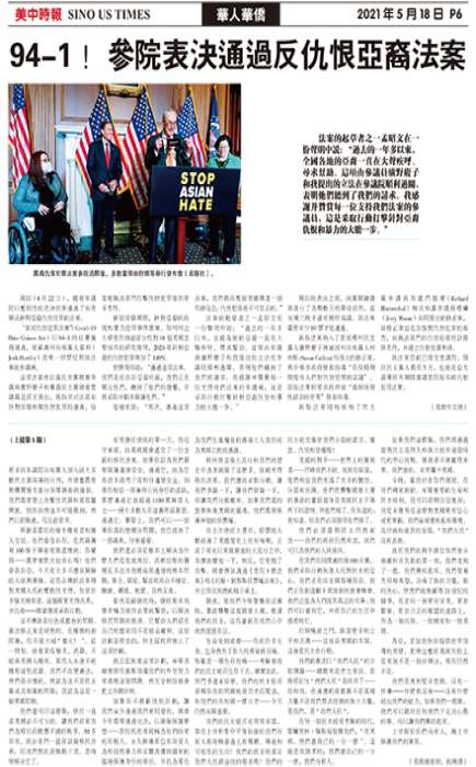 法案的起草者之一孟昭文在一份声明中说:“过去的一年多以来,全国各地的亚裔一直在大声疾呼、寻求帮助。这项由参议员广野庆子和我提出的立法在参议院顺利过关,表明他们听到了我们的请求。我感谢并赞赏每一位支持我们法案的参议员,这是采取行动打击针对亚裔仇恨和暴力的大胆一步。”图为仇恨犯罪法案参院过关后,多数党领袖舒默等举行发布会(美联社)。周四(4月22日),国会参议院以压倒性的表决结果通过了旨在解决针对亚裔仇恨犯罪的法案。“新冠仇恨犯罪法案”(C...