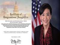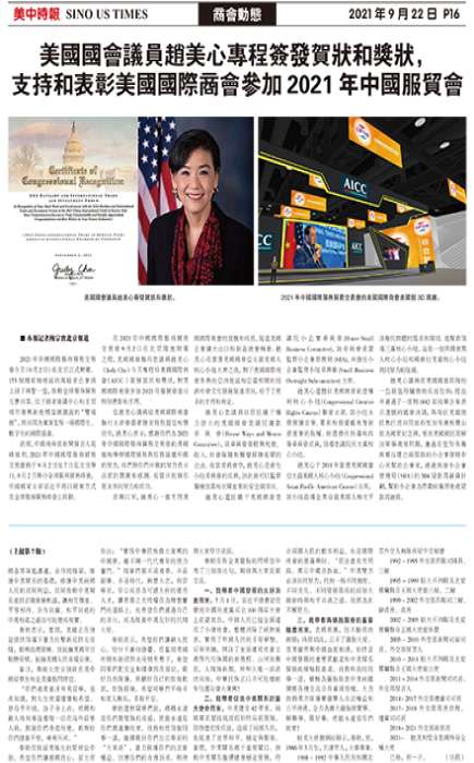 美国国会议员赵美心专程签发贺状和奖状,支持和表彰美国国际商会参加2021年中国服贸会