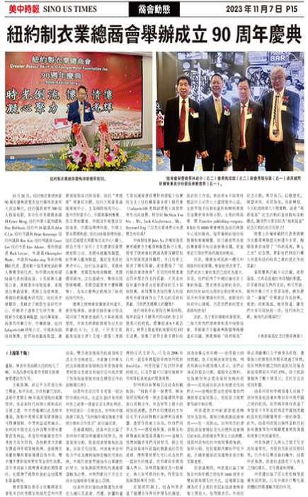 10月26日,纽约制衣业总商会90周年庆典晚宴在纽约华埠喜运来大酒店举行,纽约侨政商界300余人到场祝贺,其中包括美国国会议员GraceMeng,纽约州第十区州议员DanHoldman,纽约州16区议员JohnC.Liu,纽约市议员BrianKavanagn纽约州议员RonKim纽约州议员GraceLee纽约市长EricAdams、曼哈顿区长MarkLevine、市议员ChristopherMarte、市议员Sandrazing等政府机构的代表.还有数十个美东地区的华人华团领袖代表,和中国内地相关组织代表到场祝贺。(美国华人建筑公会、美国美中时装协...