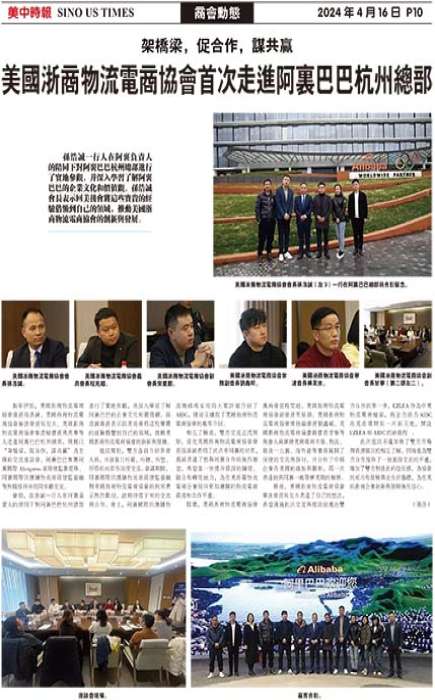 美国浙商物流电商协会会长孙浩诚(左3)一行在阿里巴巴总部前合影留念。新年伊始,美国浙商物流电商协会会长孙浩诚、美国浙商物流电商协会宁波会长吴友水、美国浙商物流电商协会宁波秘书长马燕华等人走进阿里巴巴杭州总部,开展以“架桥梁,促合作,谋共赢”为主题的交流座谈会。阿里巴巴集团阿里国际Aliexpress高级总监黄爱珠、阿里国际供应链物流高级总监裔韻等热情接待并陪同参观交流。会前,孙浩诚一行人在阿里负责人的陪同下对阿里巴巴杭州总部进行了实地参观,并深入...