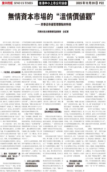 在许多人看来,资本市场是一台冰冷的精密仪器,只以盈亏估值丈量价值,从不怜悯弱者。眼泪与情怀在K线起伏中一文不值。近年来,围绕香港资本市场,席春迎博士在《大公报》上发表多篇重磅文章,《香港中小上市公司市值管理》一书的出版,标志着席春迎市值管理学术观点的系统化,细品其书,其中却包含“温情价值观”,其特征如下:一、立足香港,蕴含家国情怀《市值管理》一书并非冰冷的资本市场分析,席春迎在香港十五年的资本市场实践,正是其家国情怀的生动注脚。2005年,...