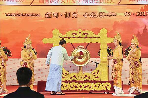 缅甸副总统吴敏瑞敲响金锣,大会鸣锣开幕。