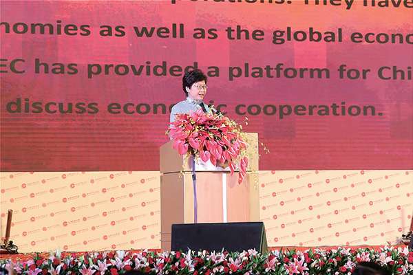 香港特区行政长官林郑月娥在大会上发表主旨演讲(中新社记者 张晨翼 摄)。