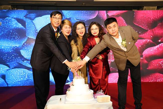 王长胜先生、爱丽丝女士、孔丽娜女士、韩香玉女士、闫宗伟先生共同为女企业家分享节日蛋糕。
