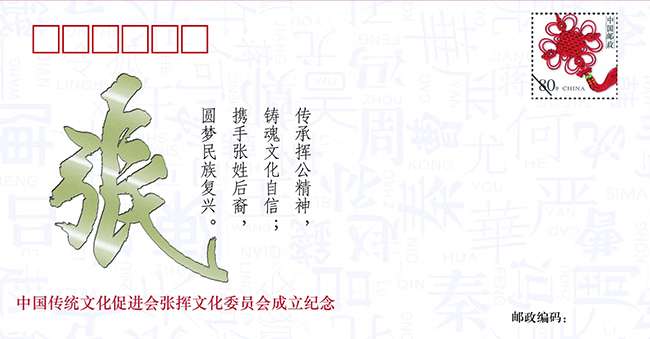 中国邮政百家姓邮局现场发行了由著名品牌战略专家、传统文化研究专家张华夏创意设计的主题纪念封,封面由“张氏”二字创意的合体字,以毛笔书法创作,形神兼备。以中国元素,展现了中国书法造型艺术的审美意境及中国传统文化的思想魅力。旁注一幅对联”传承挥公精神,铸魂文化自信;携手张姓后裔,圆梦民族复兴。”概括了活动的指导思想,紧扣时代脉搏。