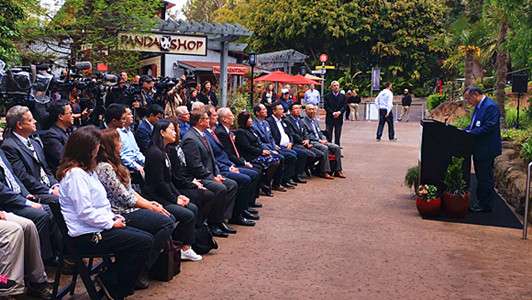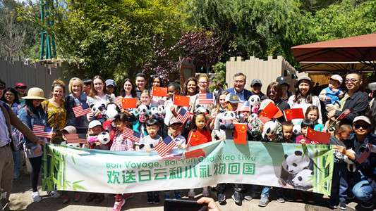 2019年4月6日,圣地亚哥动物园为大熊猫“白云”和“小礼物”即将回国举办送行活动。张平总领事和夫人陈蔚、圣地亚哥动物园国际集团总裁迈尔斯、园长斯科特等出席。