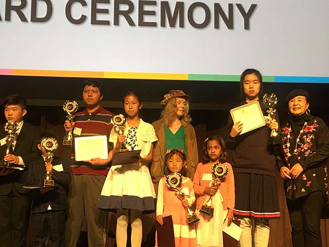 美国当代艺术研究会会长.画家王敏Min W 丹黛逸馨和 美国阳光学院青少年宫郑重院长与获奖John Jiang 蒋准、康偌儿 等学生在颁奖典礼上合影。
