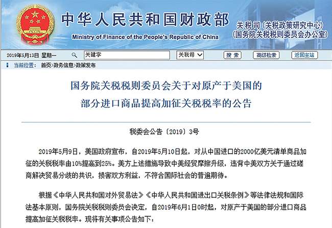 国务院关税税则委员会13日发布公告,2019年5月9日,美国政府宣布,自2019年5月10日起,对从中国进口的2000亿美元清单商品加征的关税税率由10%提高到25%。美方上述措施导致中美经贸摩擦升级,违背中美双方通过磋商解决贸易分歧的共识,损害双方利益,不符合国际社会的普遍期待。为捍卫多边贸易体制,捍卫自身合法权益,中方不得不对原产于美国的部分进口商品调整加征关税措施。