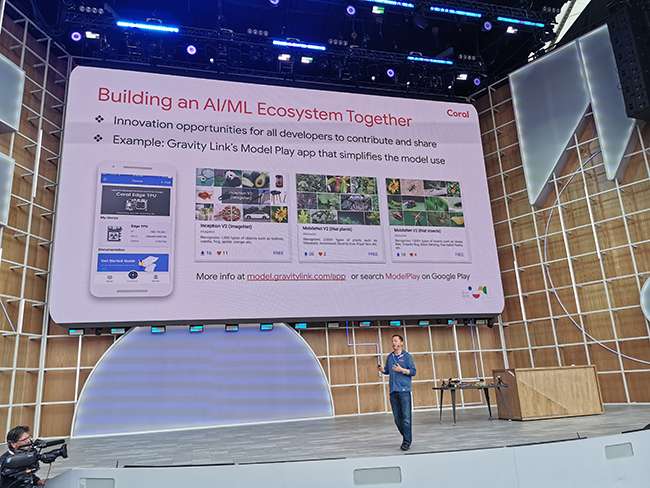 Google Coral 项目的工程师Bill,在I/O大会现场向观众展示了可搭配Coral硬件使用的Model Play App。来自全球近千名观众观看了演示,线上同时直播,观众上万人。部分亲临现场以及通过观看网路直播的开发者,会后在社交媒体表示:看到有能够支持适配Coral的软件发布,且app本身内置了多个有意思的模型,很想立即下载体验下。