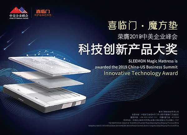 被誉为“中国床垫第一股”的喜临门家具股份有限公司,对睡眠科技的创新从未止步,始终着眼于世界床垫科技潮流前沿,将“科学睡眠”理念以不断创新的产品呈现于世人。为表彰喜临门家具“致力于人类健康睡眠”的的辉煌成就与发展目标,中美企业峰会组委会授予“喜临门·魔方垫”——《2019中美企业峰会·科技创新产品大奖》。