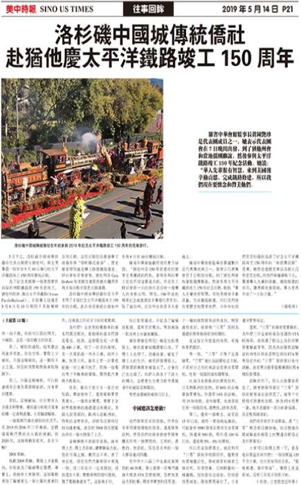 洛杉矶中国城传统侨社在今年支持了多个纪念太平洋铁路竣工150年的活动,此次也受邀前往犹他州参与8日至10日庆祝活动。