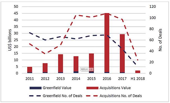 围绕美国投资审查程序的不确定性增加,以及北京近期加强对资本外流控制的努力,导致近年来中国对美国的外国直接投资流量下降。2017年,私营经济咨询公司Rhodium Group估计中国的外国直接投资流入 美国总额为294亿美元,低于2016年的456亿美元(图1)。2018年,中国在美国的外国直接投资降至48亿美元,为2010年以来的最低水平。并购(M&A)占中国对外直接投资总额的绝大部分(2017年为97%),其余包括资本密集的绿地投资。