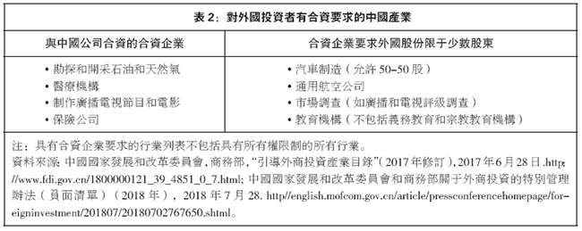 根据中国商务部运营的中国投资促进局的数据,仅在2015年中国就建立了超过6,000家与外国合作伙伴的新合资企业,中国外商直接投资流量约278亿美元。在多个行业中,外国公司必须与中国合作伙伴组成合资企业,才能得以在中国投资或运营(表2)。 通常,合资企业的中方合作伙伴将要求其外国合作伙伴分享技术和专业知识,从而将技术转让给中国。尽管近年来中国对外国投资的规定已经自由化,但中国的外国投资政策仍然要求外国公司与当地公司合作,在限制行业开展业务,而在某些行业(通常涉及国家安全或其他关键基础设施部门的行业))外国投资仍严格禁止。