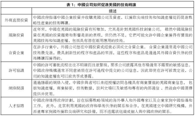 为了支持其技术发展,中国政府依靠几种不同的方式来获取美国技术,包括(1)在外国技术公司寻求外国直接投资;(2)对外国技术公司和创业公司进行风险投资;(3)外国公司与中国公司之间建立合资企业;(4)要求外国公司在中国运营的许可协议;(5)进行网络间谍活动以窃取知识产权,以及(6)吸引美国专家和研究人员为中国公司工作或与中国公司合作。以下部分将探讨中国公司如何应用这六种方法中的每一种来获取美国的技术和知识产权(表1)。